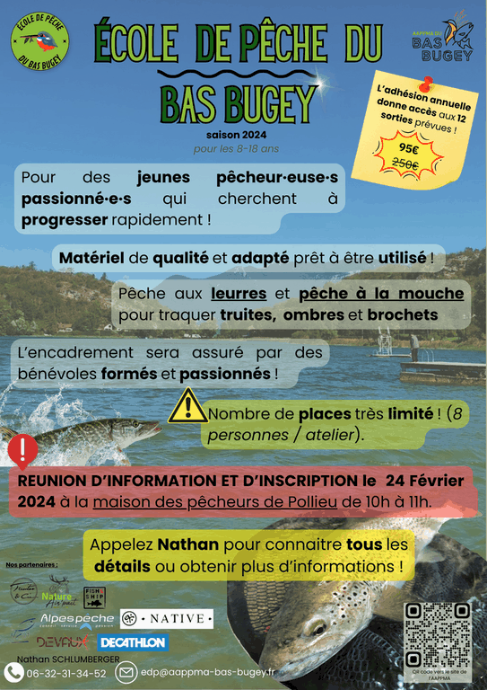 Cette année 2024, l'école de Pêche s'adresse aux jeunes pêcheur·euse·s passionné·e·s entre 8 et 18 ans qui souhaitent découvrir et/ou se perfectionner dans la pêche aux leurres et la pêche à la mouche. Ces techniques demandent une gestuelle précise et un apprentissage rigoureux. Avoir déjà une culture pêche et une maitrise de la pêche au coup ou au lancer est un plus qui permettra à l'enfant de progresser rapidement et prendre ses premiers poissons dès les premiers ateliers.